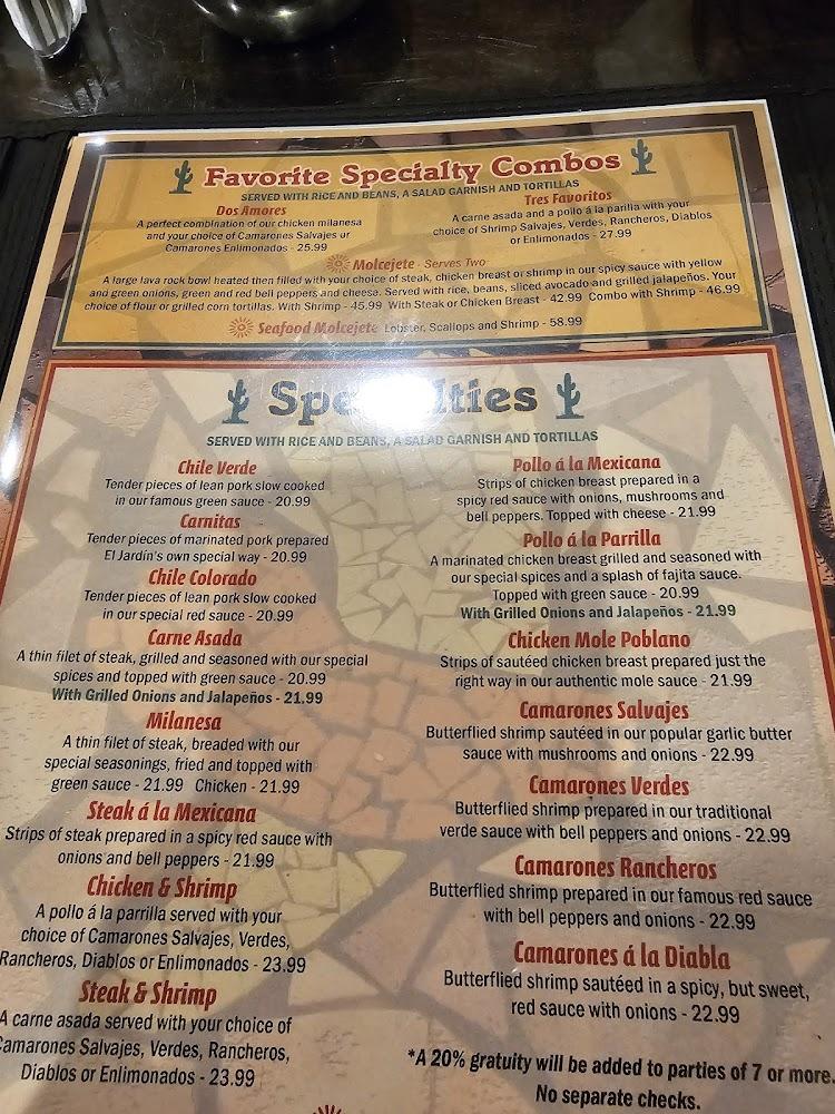 The menu at El Jardin showcases a delightful range of traditional Mexican dishes. Highlights include fajitas, enchiladas, and a selection of tacos. Most dishes feature fresh ingredients, emphasizing flavor and authenticity.